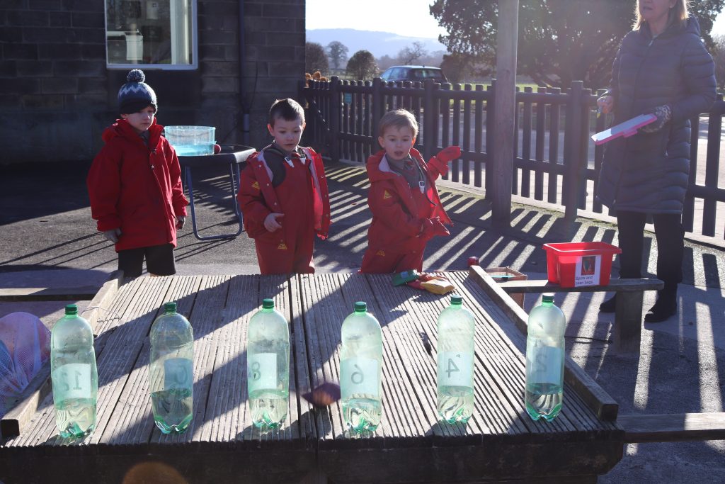 The children rolled a dice then had to double that number using their two times tables. When they worked out the final number, they took a beanbag and had to try and knock over the correct numbered bottle.